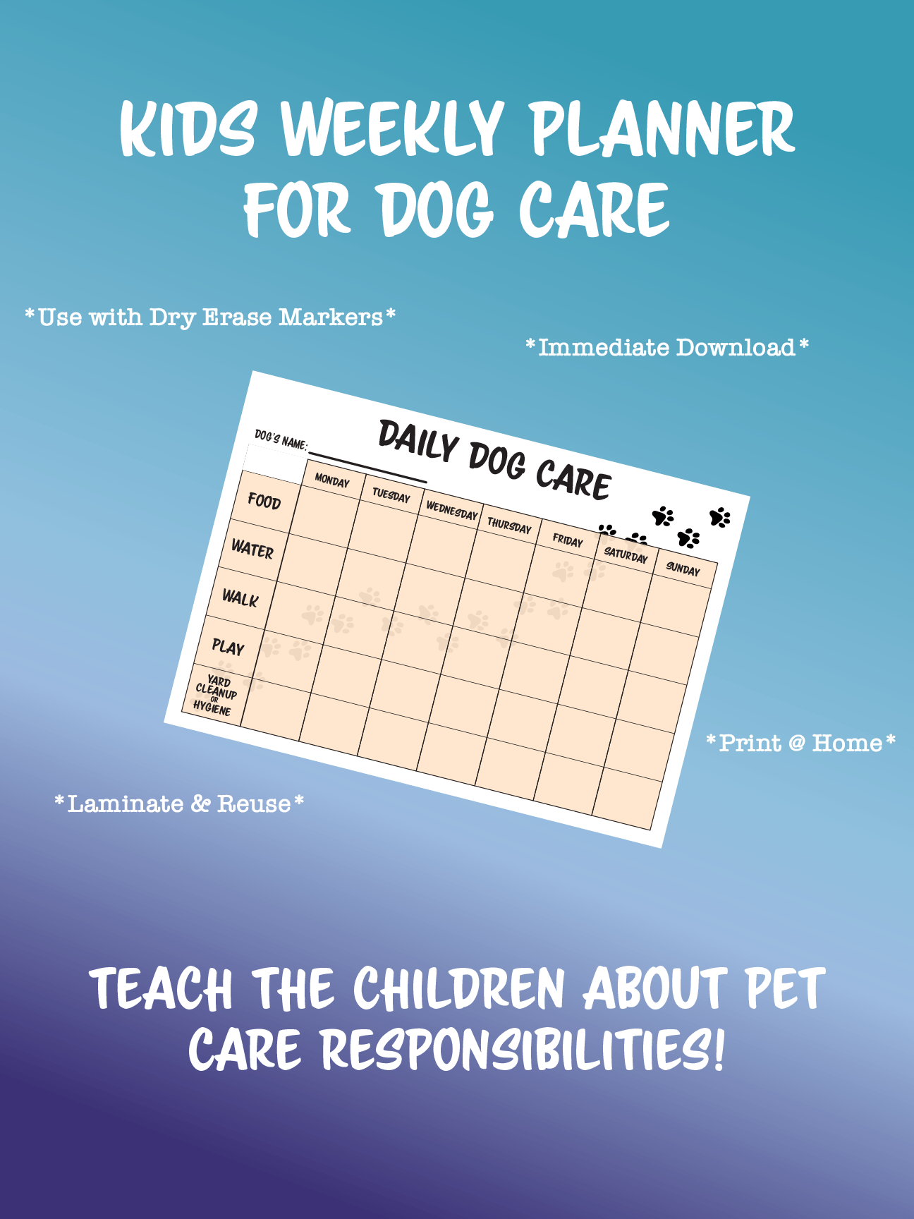 This Pawsome Planner is a delightful, one-page weekly planner designed to help children learn the joys and responsibilities of dog ownership. This innovative tool transforms pet care into an engaging and educational experience for young animal lovers.